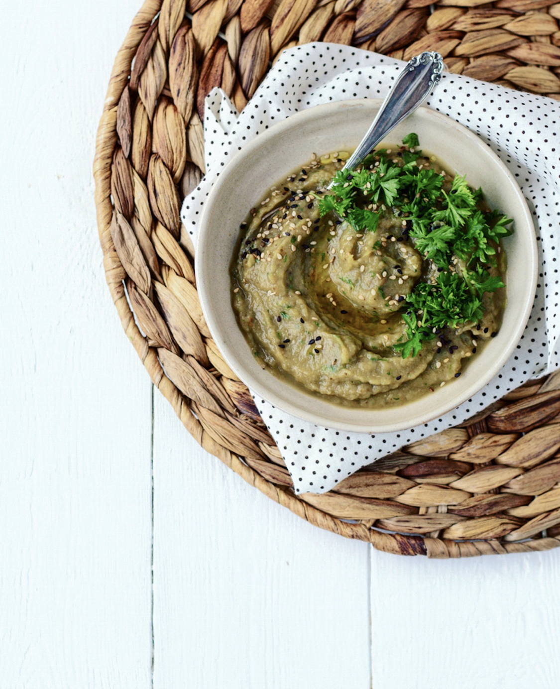 - Kom indmaden af auberginerne samt de øvrige ingredienser (undtagen sesamfrø) i en skål og stavblend (eller mos grundigt med en gaffel), til konsistensen er som ønsket. Jeg synes, det er lækkert med en cremet og glat dip.
