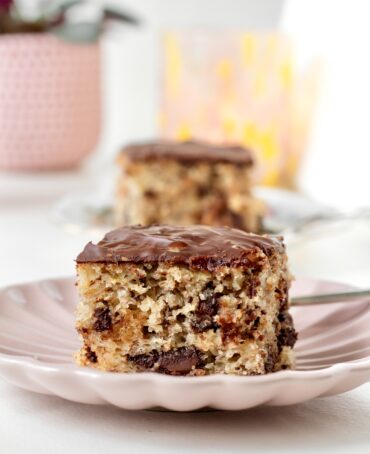 Banankage er en af mine yndlingskager, og det her er – hvis jeg selv må sige det – byens bedste banankage. Jeg elsker kombinationen af sød banan, mørk chokolade i saftig, svampet kage. Nem er min banankage også, og så indeholder den overraskende lidt smør.