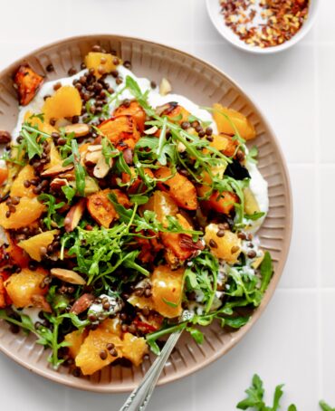 Der er bagt blødhed fra hokkaido og løg, der er saft og sødme fra appelsin og der er cremet protein fra hytteostcremen. Plus mere protein fra linserne, pebret sprødhed fra rucola, styrke fra chili og knas fra mandler.