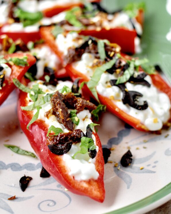 - Kom ønsket mængde hytteost i de halverede snackpebre (masser af hytteost, hvis du spø'r mig) og kom soltørrede tomater, oliven, frisk basilikum på. Drys med hvidløgspeber og havsalt.