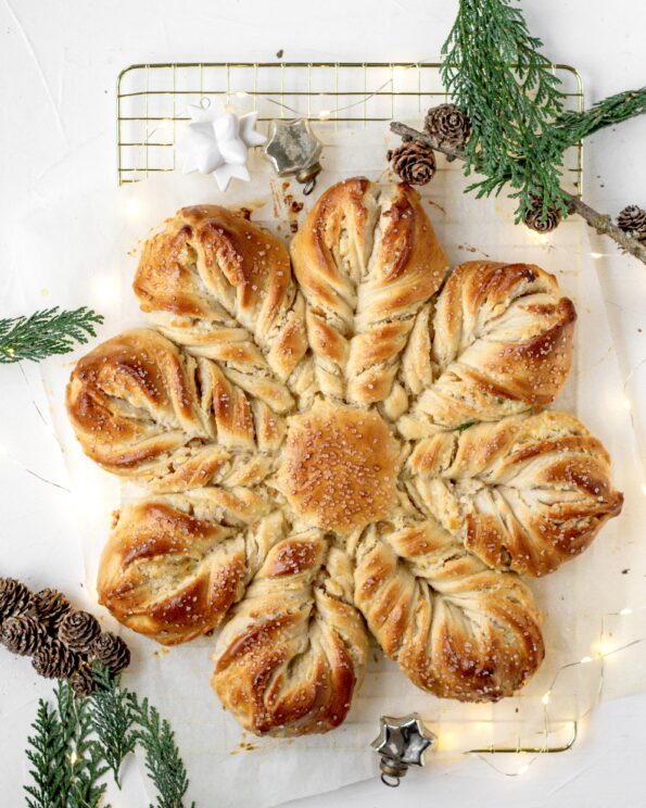 Julestjernen er MEGET nemmere at lave, end man skulle tro, og da jeg først havde taget mod til mig og prøvet at lave den, kunne jeg slet ikke stoppe igen. Sådan en stjerne gør sig så utroligt flot på ethvert kaffebord. Og prøv at servere den til en lækker brunch også. Du vil modtage så mange “wauw!” og “hvor er du go’!”, at du næsten bliver helt flov.