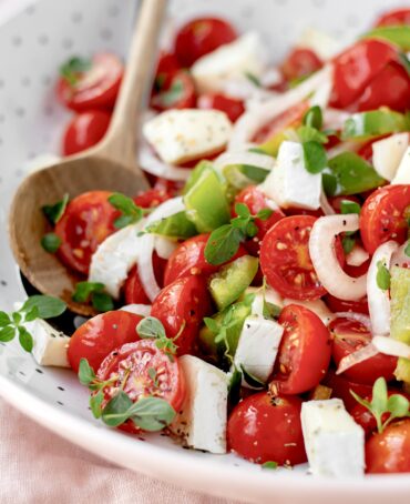 Da vi var på Mallorca for et par år siden, fik jeg en af dagene lyst til at bruge de lækre lokale tomater og peberfrugter i en enkel salat ~ sammen med brie.