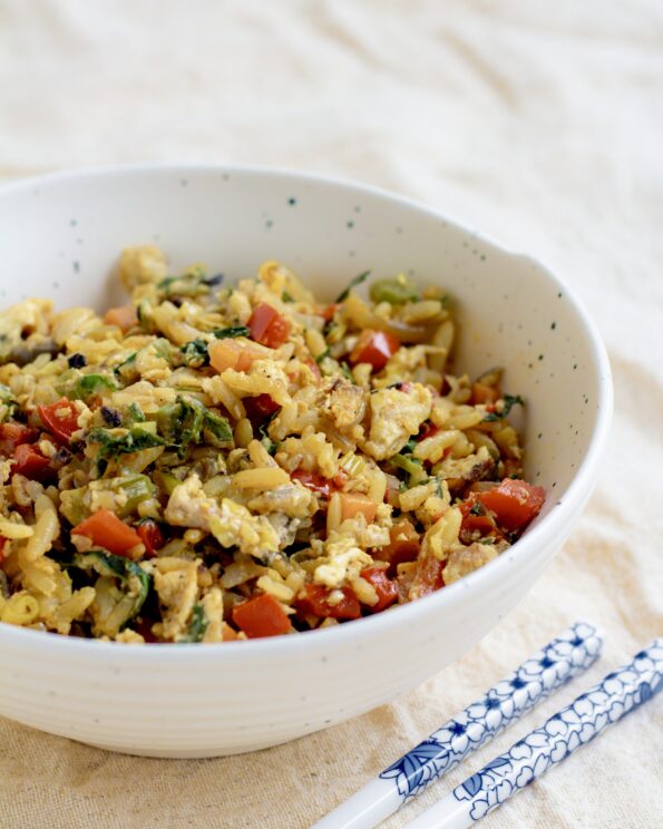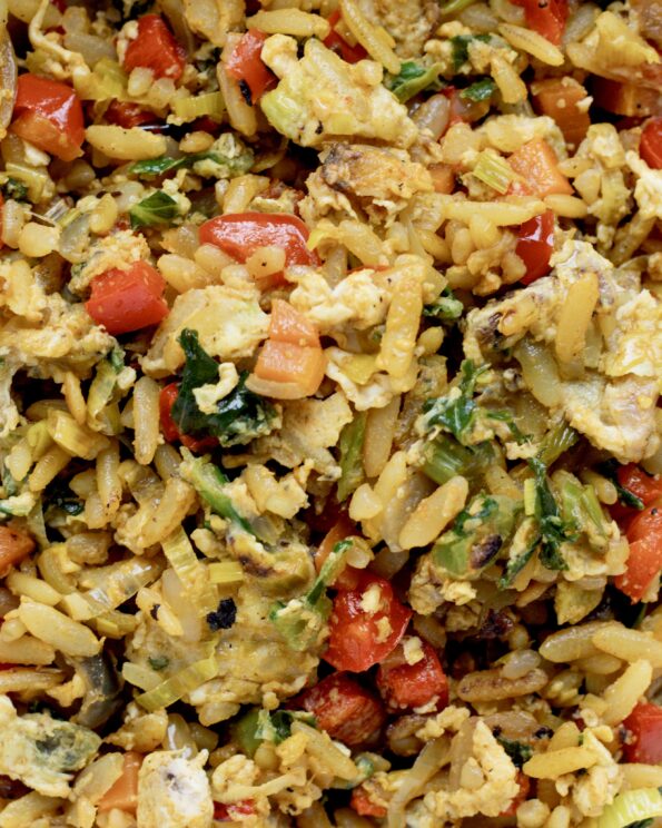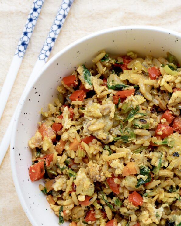 Det her er en ægte grøntsagsbombe! Maaasser af grøntsager. MASSER! Plus protein i form af æg. Og – min yndlings-stegte-ris-version – brune ris. Fordi brune ris har mere fasthed end hvide ris, synes jeg, brune ris fungerer rigtig godt i fx stegte ris og paella.
