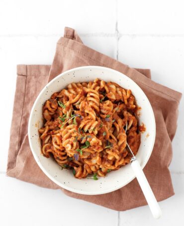 Her får du lige en dejligt nem opskrift på en tomatsauce med sneaky beans, jeg kalder den nulkommafemtomatsauce – du kan nok godt regne ud ud, hvorfor saucen hedder sådan.