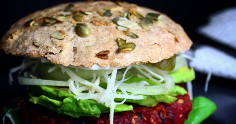 Bøffen er en lækker og smagfuld mexi-rødbedebøf med kidneybønner. Fyldet er salatmayo, frisk spinat, avocado, rå løg, syltede agurker samt masser af høvlet peberrod. Bollen? Fuldkorn, selvfølgelig, og opskriften kan findes her.