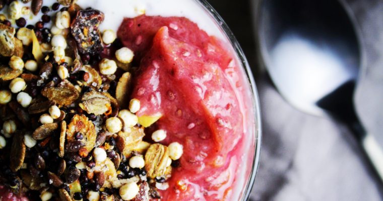 I denne kompot får rabarberne godt selskab af chiafrø, vanille og mandler. Den kombination giver en dejlig, frisk kompot med sødme fra vanillen, crunch fra mandlerne og tekstur og gelering fra chiafrøene. Samtidig giver både mandlerne og chiafrøene god næring i form af blandt andet omega 3, protein og de gode fedtkilder.