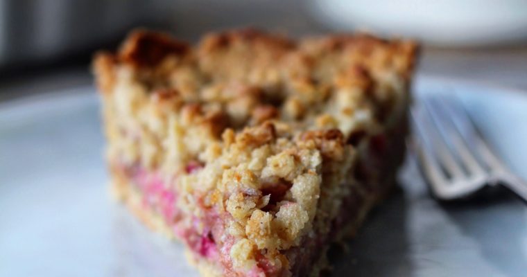 Rabarbertærte og -kage kan laves i mange afskygninger, dette er en ret traditionel en af slagsen, og den indeholder både hvedemel, sukker og smør. Ja, det gør den! For den slags skal der altså også være plads til somme tider. Slut med forbudt! Der skal være balance, og der er ikke balance, hvis der er ting, man ikke må spise. I min optik skal der være plads til lidt af det hele.