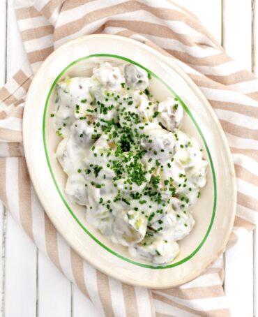 Kogte, kolde kartofler, frisk agurk, den cremedeste hytteostcreme med rygeost og et drys purløg på toppen: Det lækreste, mest sofistikerede kartoffeltilbehør i byen.