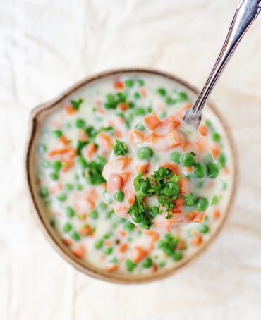 Og så skete det pludselig for nylig: Jeg fik lyst til stuvede grønærter! Hvordan det opstod, ved jeg ikke, men tanken om ærter og gulerødder i en venlig og cremet sauce: Ja tak!