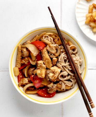 De her sur-søde grøntsager med nudler er født med tofu, men opskrifter er jo lavet for at justere til ens egne smagsløg, så hvis du ikke er til tofu skifter du bare ud med fx edamamebønner eller sorte bønner.